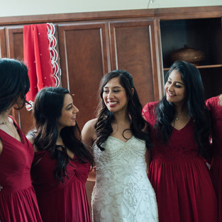 Traditionally, Brides wear red, so the bride chose to wear a hand-created veil and the bridesmaids wore a cranberry colored dress to match the colors.